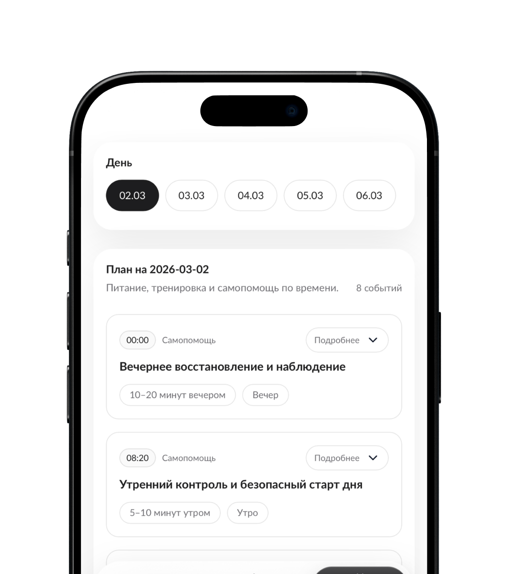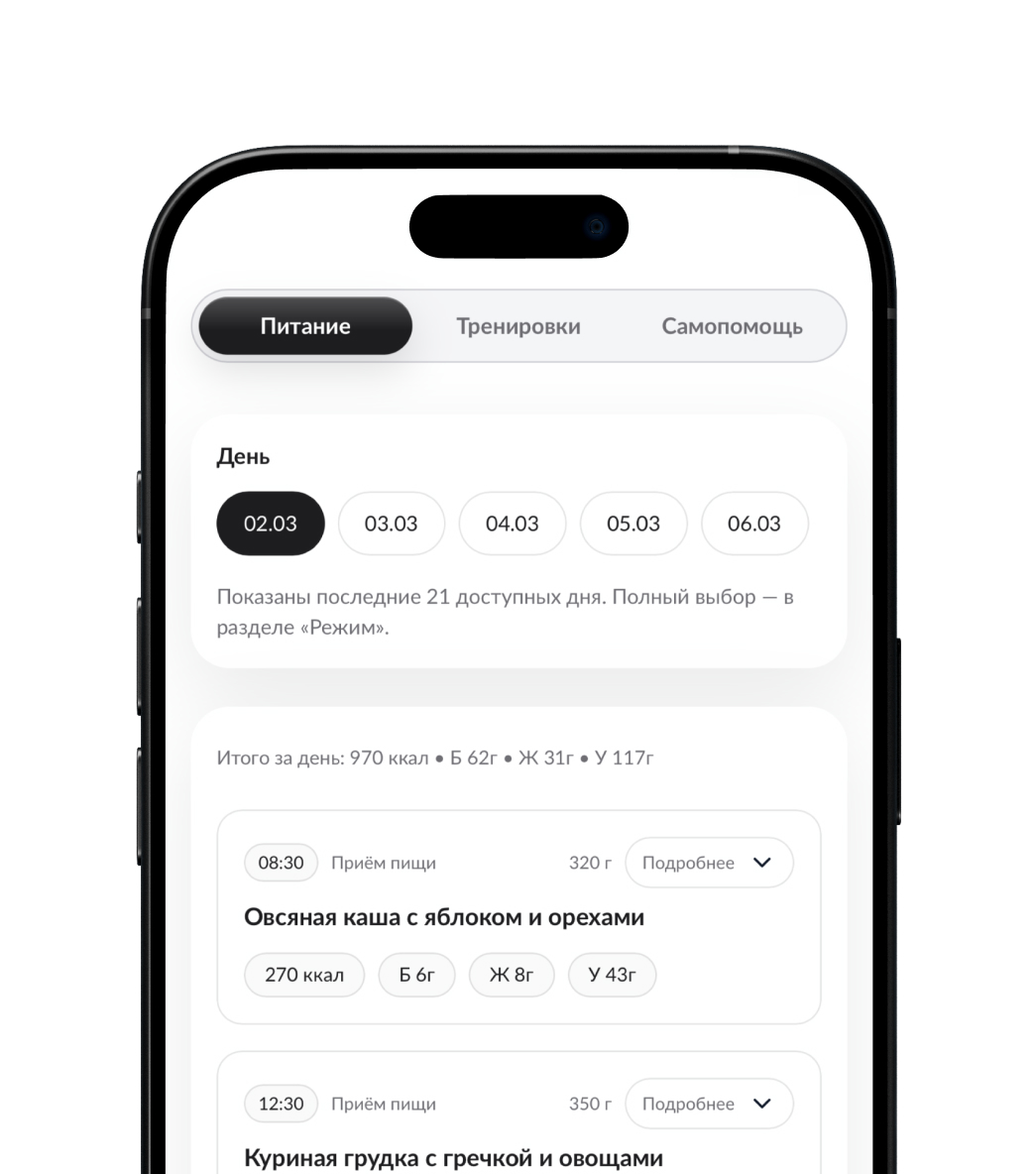 В одном месте — питание, тренировки и самопомощь с привязкой ко времени и подробными инструкциями