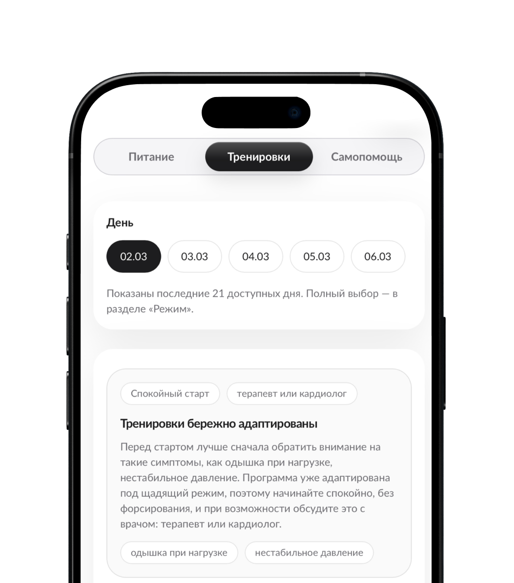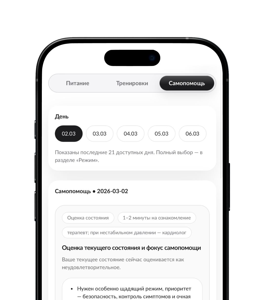 Если нагрузки противопоказаны — программа предложит альтернативы и предупредит об ограничениях.